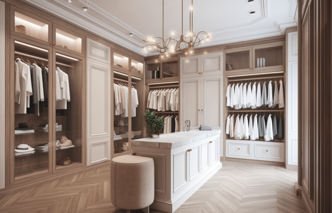 U型衣帽間是單獨利用一個房間或空間作為衣物存放的地方,U字型布局的設計不管是上方或是拐角的空間都能夠被充分利用到。