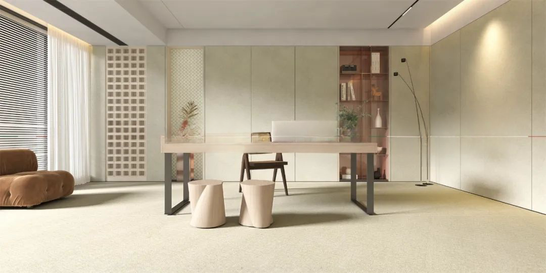 整個書房以奶油黃打底,墻面和地面采用的是愛因斯坦巖板克洛伊,布紋的肌理感,自帶光影效果,讓質(zhì)感與溫暖共存。
